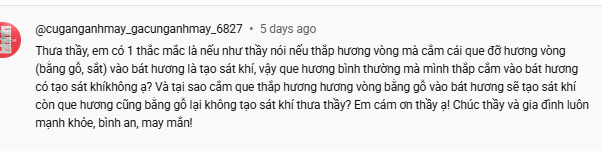 Thưa thầy, em có 1 thắc mắc là nếu như thầy nói nếu thắp hương vòng mà cắm cái que đỡ hương vòng (bằng gỗ, sắt) vào bát hương là tạo sát khí, vậy que hương bình thường mà mình thắp cắm vào bát hương có tạo sát khíkhông ạ? Và tại sao cắm que thắp hương hương vòng bằng gỗ vào bát hương sẽ tạo sát khí còn que hương cũng bằng gỗ lại không tạo sát khí thưa thầy? Em cám ơn thầy ạ! Chúc thầy và gia đình luôn mạnh khỏe, bình an, may mắn!